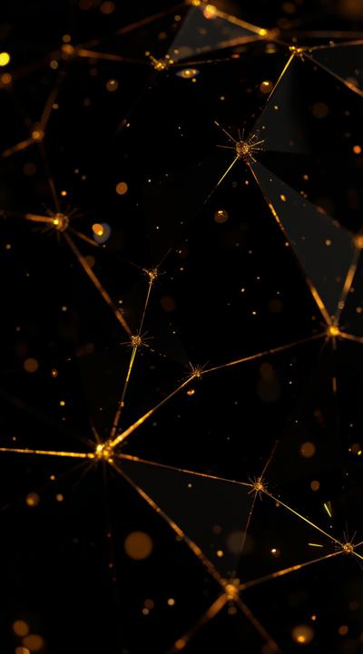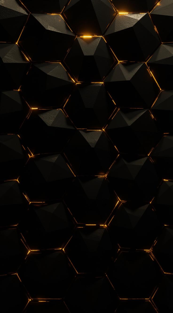 Создай 3D-геометрический узор с чёрными многогранниками, очерченными золотыми линиями. Эффект глубины должен быть выраженным — используй тени и световые блики на гранях фигур. Композиция — бесшовная, с повторяющимся рисунком. Цветовая палитра: чёрный и золотой, без других оттенков. Стиль — современный, премиальный