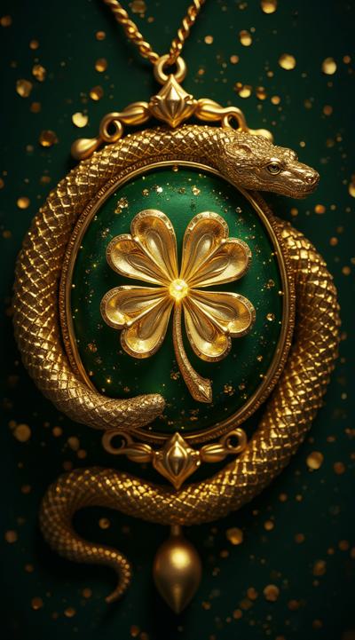 Представь мистическую сцену: золотая змея, словно ожившая из древних легенд, бережно обвивает магический четырёхлистный клевер — символ удачи. Клевер сияет, как драгоценный камень, в его центре пульсирует бриллиант. Тёмно-зелёный фон и золотые орнаменты создают атмосферу древнего амулета. Вокруг композиции — россыпь мелких клеверов и изумрудов, будто зачарованных магией. Стиль — смесь ар-деко и фэнтези, с акцентом на блеск и загадочность.