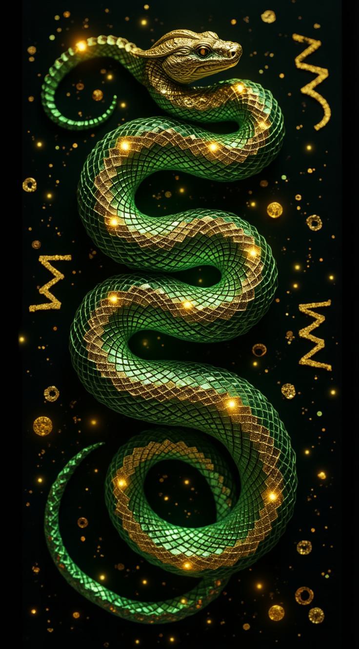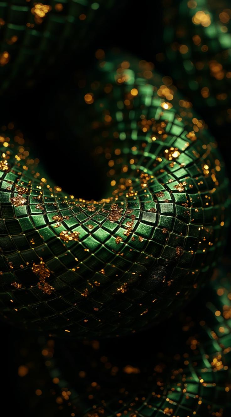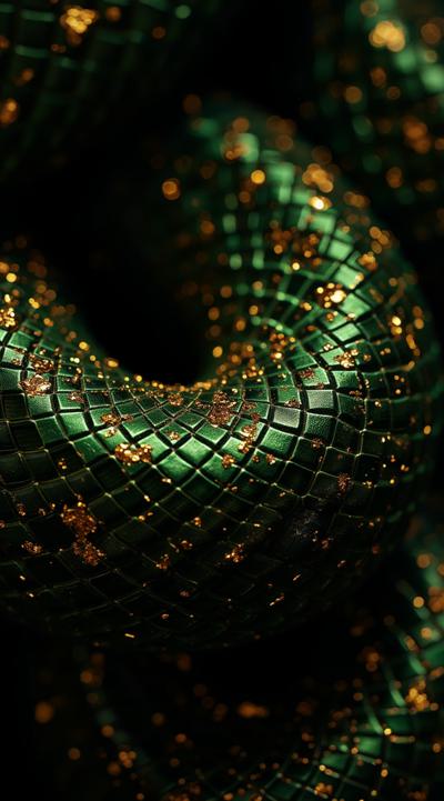 Представь фантастическую интерпретацию змеиной кожи: зелёные чешуйки, словно кристаллы, переливаются на чёрном фоне. Узор напоминает древние руны или магические символы, собранные в волнообразный рисунок. Добавь мистическое свечение на некоторых чешуйках, чтобы создать ощущение магии и силы. Композиция должна выглядеть загадочно и завораживающе.