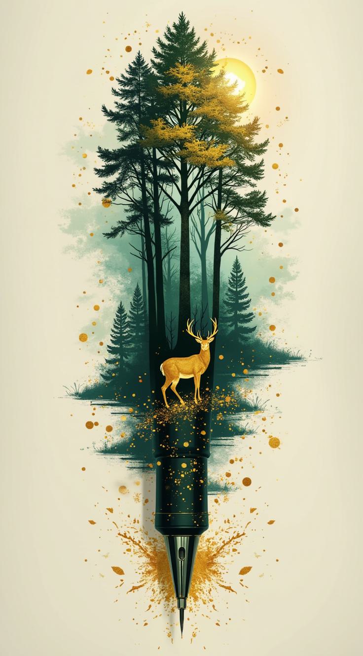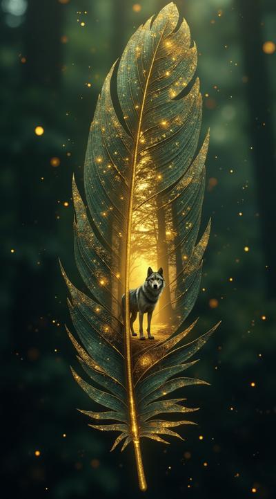 Представь перо как портал в волшебный лес. Внутри его контура разверни мистическую сцену: туманный хвойный лес, где на освещённой поляне стоит величественная Вочица — хранитель этого мира. Перо должно выглядеть живым, с плавными переливами цвета от тёмно-зелёного до золотого. Создай ощущение магии и тайны, будто лес существует в другом измерении, скрытом за границами пера.