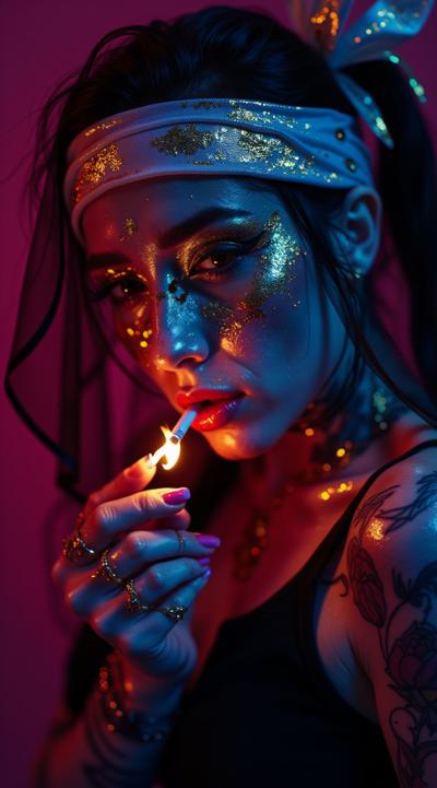фотореалистичный киберпанк-готический портрет A hyper-realistic close-up portrait of a tattooed woman wearing a black veil and a white headband, smoking a cigarette with a glowing ember. Neon red and magenta backlighting with cool blue accents, dramatic chiaroscuro shadows, visible tattoos on the neck and chest, a silver cross necklace, moodily smoky atmosphere, shallow depth of field, cinematic lens look, ultra-detailed skin textures, 8K quality, 35mm perspective.