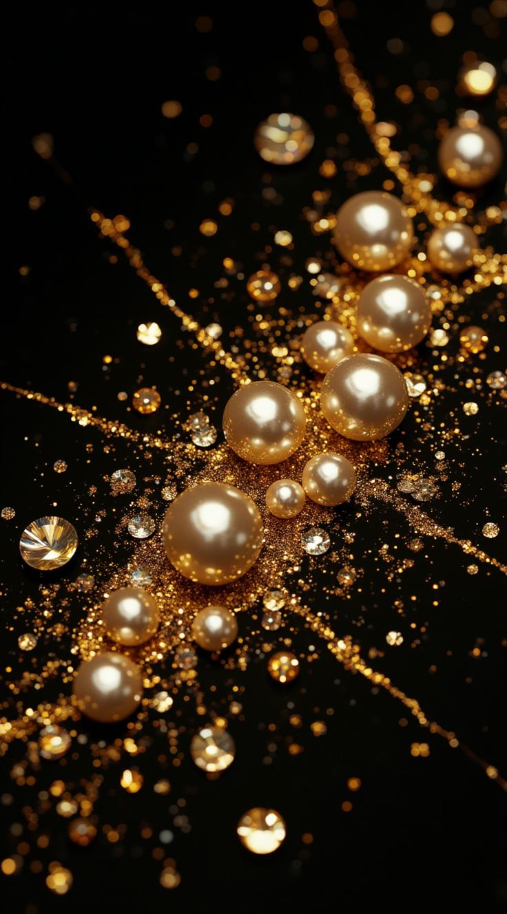 Создай детализированную абстрактную композицию: чёрный фон, поверх которого разбросаны жемчужины и блестящие бусины разных размеров и оттенков (от перламутровых до золотистых). Добавь тонкие золотые нити, пересекающие изображение под разными углами. Эффект блеска должен быть реалистичным, с яркими бликами и мягкими тенями