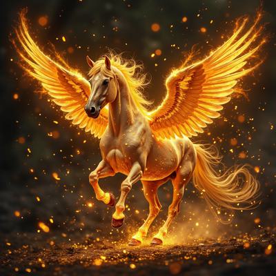 Проект: Принт "Огненная лошадь с крыльями", Описание: Создать принт с изображением огненной лошади с красивой гривой и ангельскими крыльями., , Стиль: Фэнтези, яркие и насыщенные цвета, динамичные формы., Элементы:, - Лошадь с огненными элементами и эффектной гривой, - Ангельские крылья, излучающие свет, - Элементы фона, подчеркивающие магическую атмосферу, Целевая аудитория: Любители фэнтези и оригинальной одежды (возраст 15-35 лет).