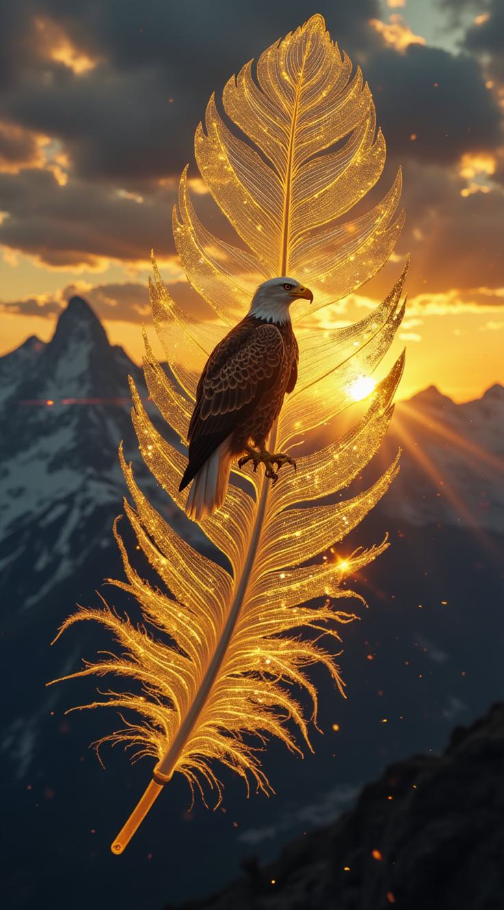 Представь перо как портал в мир природы. Внутри его контура разверни драматическую сцену: величественный белоголовый орлан, словно вырывающийся из пера, парит над горным пейзажем на фоне закатного неба. Перо должно выглядеть живым, с плавными переливами цвета от белого к золотистому. Создай ощущение магии и силы, будто орлан и природа — единое целое, заключённое в форме пера. Добавь лёгкую дымку и падающие листья, подчёркивающие динамику композиции. Композиция вертикальная, фон — светлый, нейтральный.
