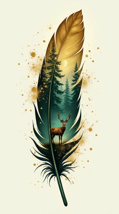 Создай художественную композицию: перо, внутри контура которого разворачивается сцена туманного леса с высокими елями и одиноким оленем на поляне. Перо должно быть прорисовано с высокой детализацией — видны бородки и стержень. Цветовая гамма: глубокие зелёные, бирюзовые, золотисто-коричневые тона. Добавь лёгкую дымку и световые акценты, чтобы подчеркнуть мистическую атмосферу леса. НА ЧЁРНОМ ФОНЕ