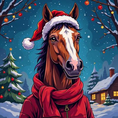 Создайте веселый и забавный принт для майки на новогоднюю тематику, в центре которого будет изображена лошадь в рождественском наряде. Лошадь должна быть одета в красный рождественский колпак и шарф, с веселым выражением лица. Добавьте к изображению элементы новогоднего декора, такие как гирлянды, снежинки и подарки, чтобы создать атмосферу праздника. Принт должен быть ярким, игривым и вызывать улыбку, идеально подходящим для новогоднего настроения.