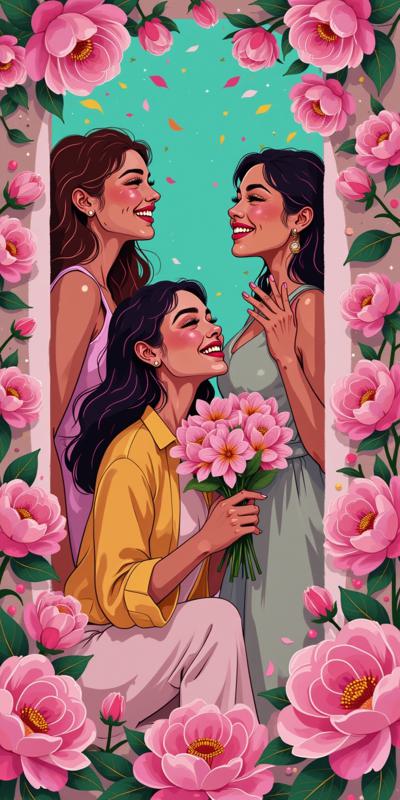 Festive composition for March 8: lush floral background in spring hues (pastel pink, green and white). White-skinned women of different ages cautiously peek out from both sides of the frame, their faces lit up with warm, sincere smiles. Some are waving their hands in greeting, others are holding bouquets of seasonal flowers (tulips, mimosas, hyacinths). The atmosphere is joyful and festive, expressing appreciation and recognition ("Well done!"). Soft diffused lighting creates a gentle glow. Style: Illustration, High detail, 4K