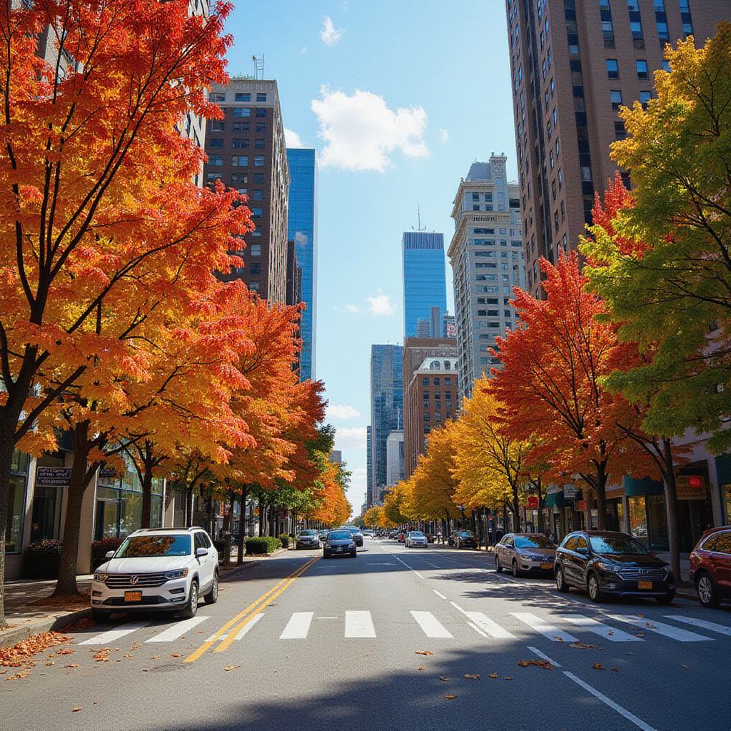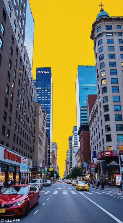 Абстрактная ЖИВОПИСЬ показывающая Нью Йоркскую улицу с видом на небоскребы с машинами и людьми , витринами и магазинами или намек на борьбу с подсознанием сюжета , представленный в сюрреалистической перспективе . Палитра желтый сочетается с синим, лиловым, светло-голубым, фиолетовым, серым, черным. ,