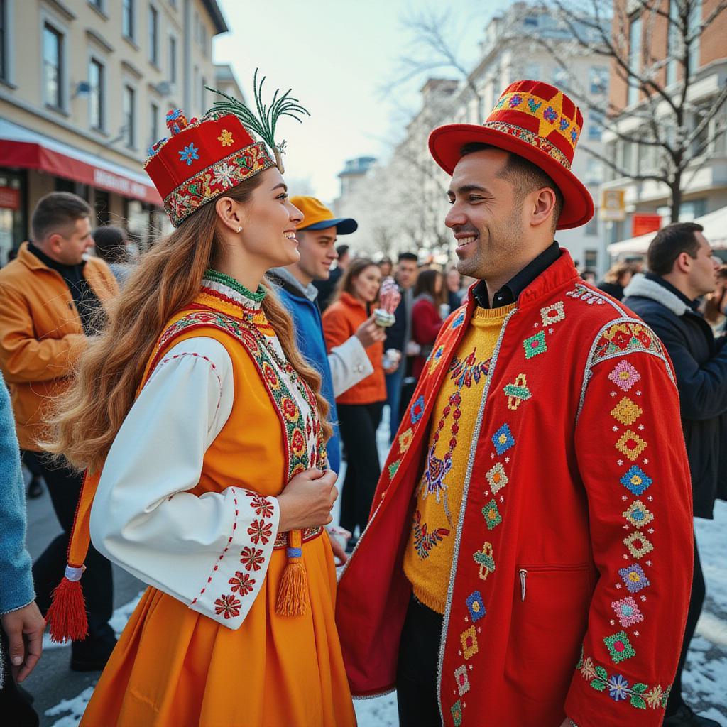 Передний план:, Веселые танцующие женщины и мужчины в традиционных зимних русских народных костюмах на масленичном гулянье, Костюмы яркие, красочные, украшенные вышивкой и орнаментами., У женщин головные уборы (кокошники или платки)., Реалистичные выражения лиц, отражающие радость и веселье., Средний план:, Масленичное гулянье с ярмарочными палатками, играми и развлечениями., Люди танцуют, играют в игры, едят блины., Задний план:, Деревянные русские дома с крышами, покрытыми снегом., ,