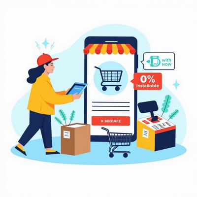 Широкоформатная витрина (16:9) с символами кредитных покупок в онлайн и офлайн магазинах — смартфон с экраном «Купи сейчас, плати потом», кредитная карта, кассовый аппарат, корзина, доставка, знак «0% рассрочка» — всё изображено в схематичном стиле, как простые линейные рисунки без деталей. Цветовая палитра: только тёмно-синий и белый. Фон — белый, элементы — синие контуры, полки — светло-синие прямоугольники. Стекло прозрачное, с лёгкими отражениями. Плоский стиль, как векторная иллюстрация, без теней и текстур, 2D, высокий контраст. Идеально для баннеров, презентаций, сайтов.