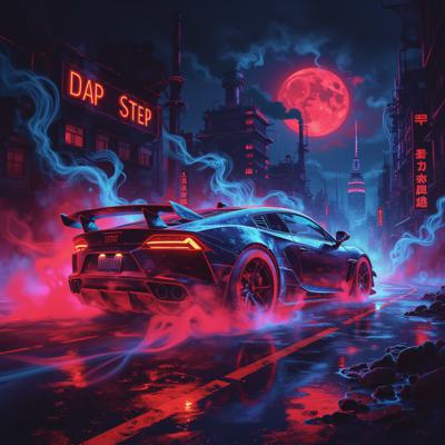 A dark, aggressive cover art for a dubstep playlist called "Dap Step". A demonic sports car drifting through smoke and neon lights at night, surrounded by industrial city ruins. Heavy bass waves visible as distorted energy. Dark red and cyan color palette, cyberpunk vibe, gritty texture, high contrast, cinematic lighting, 4k, ultra detailed, epic composition --ar 1:1 --stylize 750