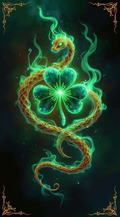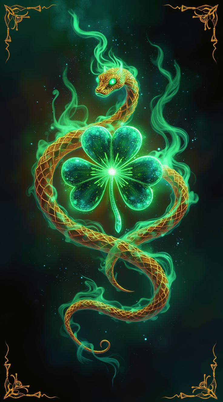 Представь мистическую сцену: золотая змея, словно ожившая из древних легенд, бережно обвивает магический четырёхлистный клевер — символ удачи. Клевер сияет, как драгоценный камень, в его центре пульсирует бриллиант. Тёмно-зелёный фон и золотые орнаменты создают атмосферу древнего амулета. Вокруг композиции — россыпь мелких клеверов и изумрудов, будто зачарованных магией. Стиль — смесь ар-деко и фэнтези, с акцентом на блеск и загадочность.