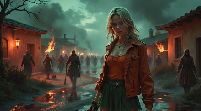 девушка Эшли Грэм блондинка из игры Resident Evil 4 одета в зеленую мини юбку, оранжевый джемпер и оранжевый пиджак, в испанской деревне, очень далеко на горизонте еле различимая толпа жителей одетых в деревенские костюмы с вилами факелами и топорами, один дом горит. мрачная атмосфера . реализм компьютерная графика