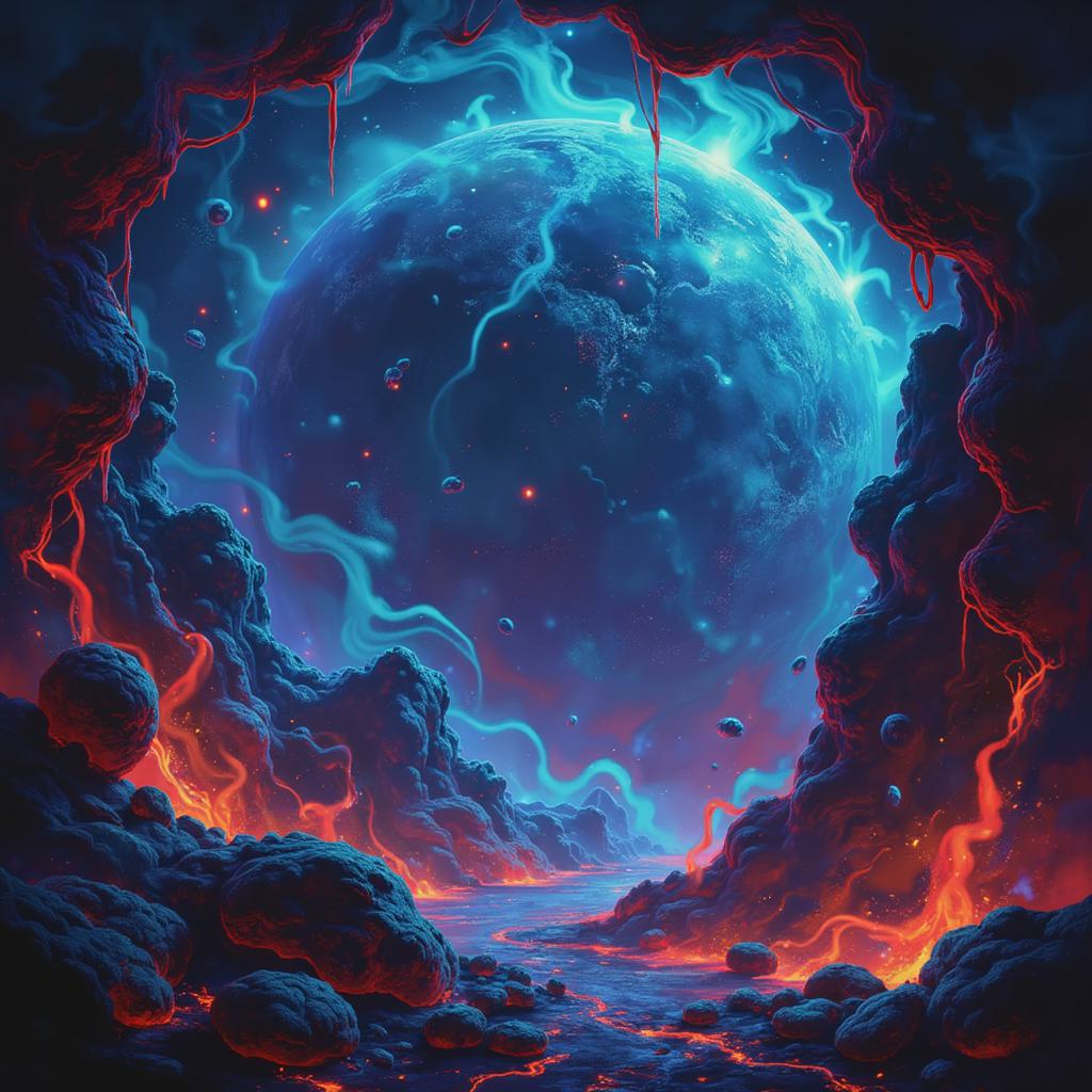 Представь поток космической энергии, застывший в абстрактной форме. Изобрази его в виде трёх полупрозрачных лент, закрученных в спираль на фоне тёмного космоса. Ленты переливаются оттенками жёлтого, голубого, розового и оранжевого, словно наполнены светом далёких звёзд. Вокруг спирали рассыпаны миллионы светящихся частиц — от крошечных искр до крупных мерцающих шаров. Создай ощущение магии и бесконечности, будто зритель заглядывает в сердце галактики.