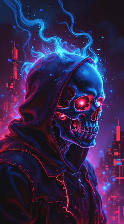 Агрессивная обложка для плейлиста дабстеп-музыки. Темный футуристический мегаполис в неоне. В центре — роботизированный череп или фигура в капюшоне, светящаяся неоново-красным и электрик-синим. Искаженные звуковые волны, битые линии, эффект глитча. Мрачная атмосфера, высокий контраст, динамичный ракурс. Стиль: киберпанк, индастриал, агрессивный дизайн. 4K.