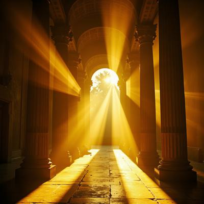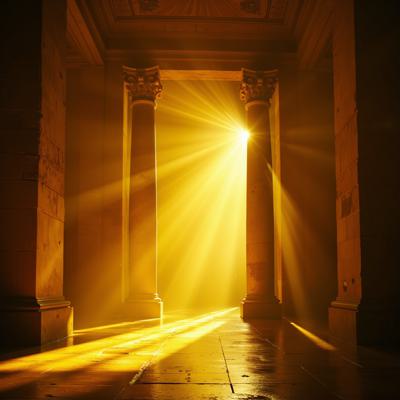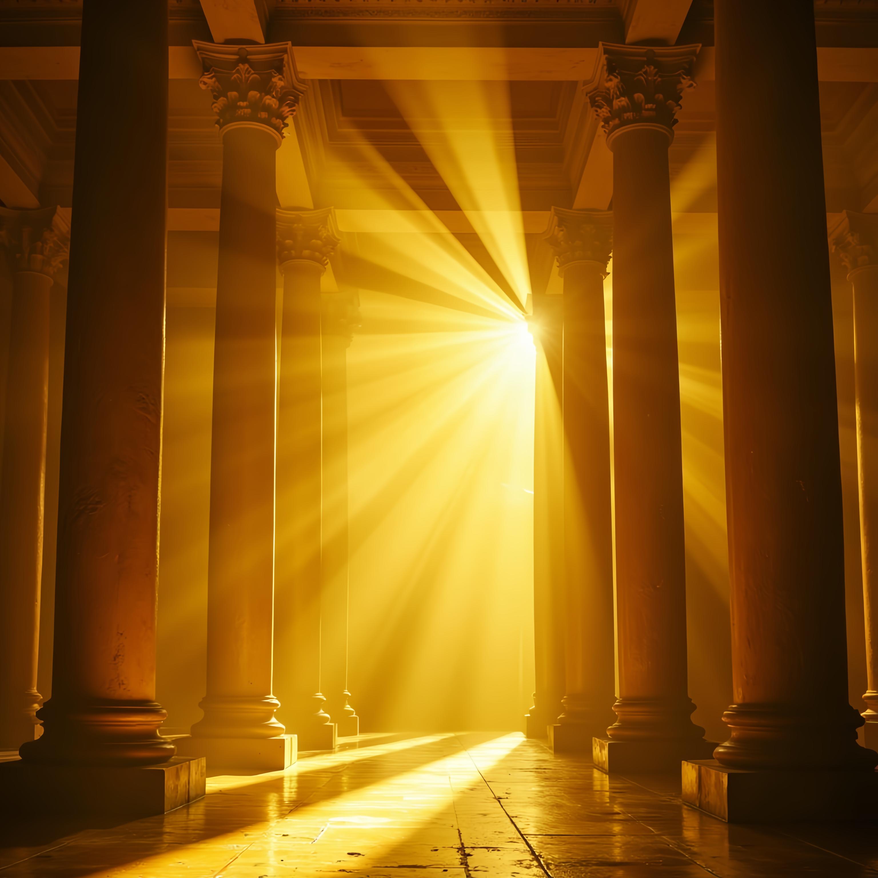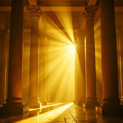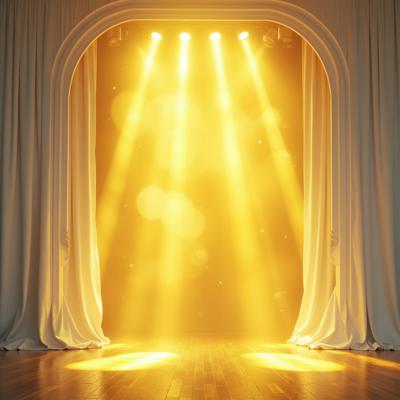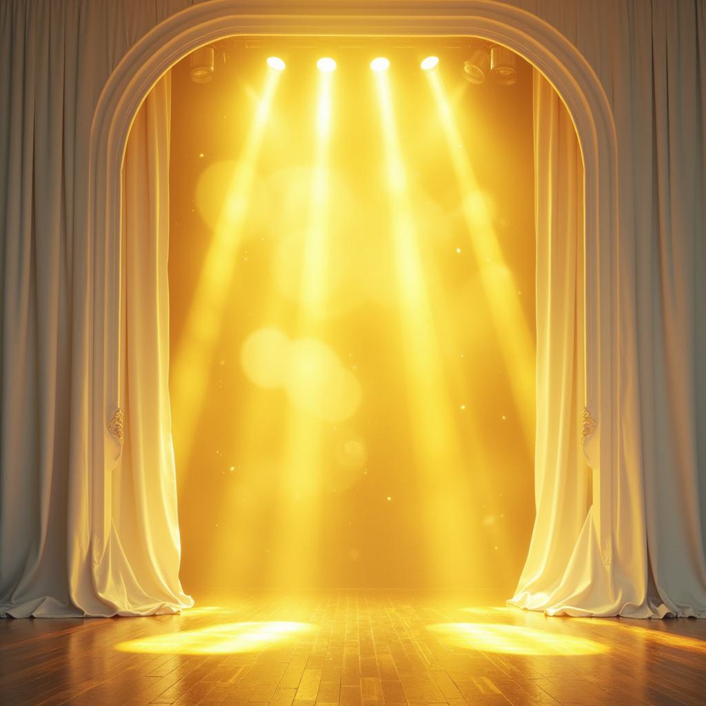 Акварель гиперреализм. Театральная сцена. Фоном белые драпировки спадают на пол ровными складками. лучи света подчёркивают рельеф складок из шёлковистой ткани. Перед этим читаются ровные вертикальные линии прозрачных гармоничных цветов стеклянных толстых четырёх колон, подсвеченных светом снизу как будто изнутри. Сверху фалдами провисают белые ленты.