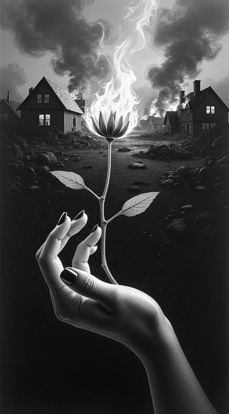 Символическая черно белая гравюра, разделённая на два плана. Драматический контраст близкого жеста и далёкого разрушения., Передний план:, Женская рука (тонкая, с изящными, но напряжёнными пальцами) держит цветок на стебле. Цветок горит. , Задний план: силуэты горящих домов. Не детальные, а размытые, как кошмар обрушенные крыши, остовы башен., Высококонтрастная гравюра. Только чистый чёрный, белый и агрессивная штриховка.