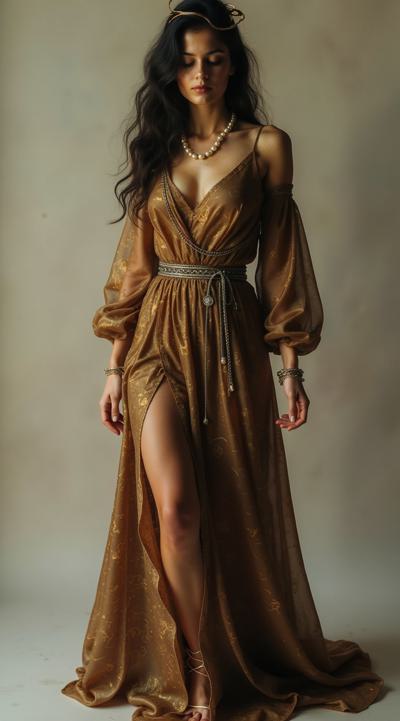 девушка в темными волосаим, тонкая талия, широкие бедра, пышные формы, облегающее длинное шелковое платье, рисунок на ткани, акцентные цвета, рукава свободные, многослойность, драпировка, тонкая цепочка, жемчуг, украшение на бёдрах руках и ногах, браслеты на щиколотках, тонкий обруч на голове, фон цветущий сад, пасмурно, стиль ар-нуво, полный рост,
