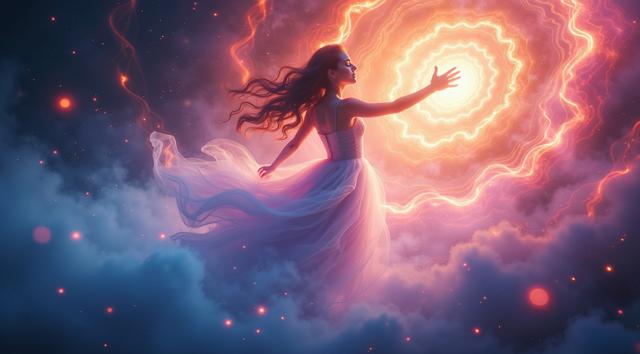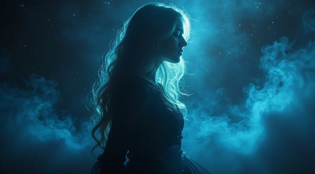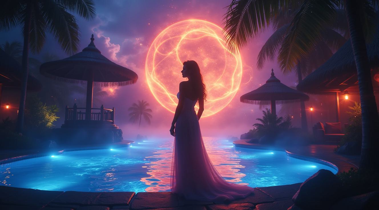 Женщина в изящной позе на фоне фантастического курорта, где реальность переплетается с магией. Её силуэт четко выделяется на фоне светящихся фракталов и кристаллических паттернов, которые кажутся живыми и пульсирующими. Атмосфера таинственности, мягкое магическое свечение, детализированные магические структуры, переплетающиеся с элементами роскошного отдыха.