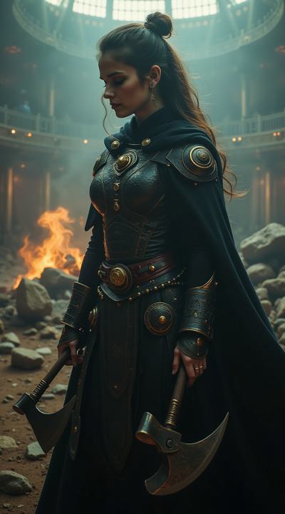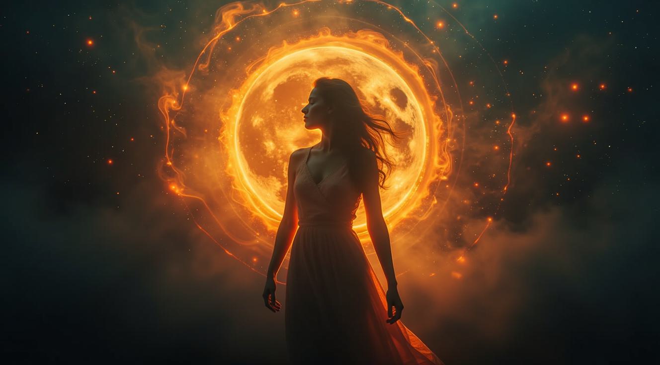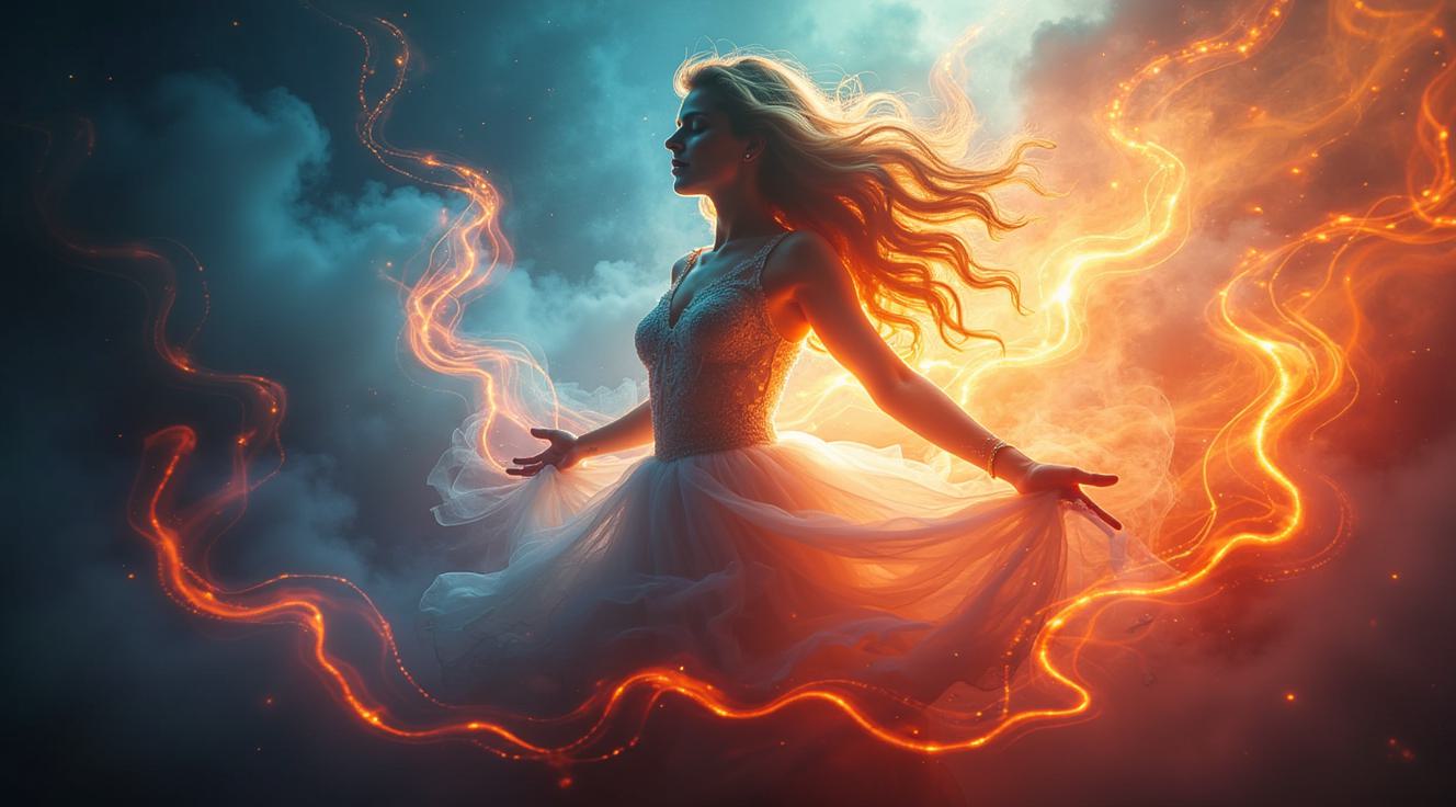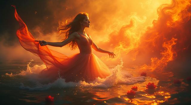 A postcard depicting women's happiness and celebration. An elegant woman with loose hair dances in fiery and aquatic flowers, surrounded by fiery flowers in the swirling water. The bouquet is directed forward, the gaze is sharp and piercing when she steps back. The background features fiery winds, supernovae, cinematic lighting, and high-quality fantasy art.