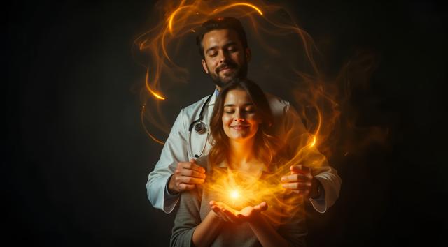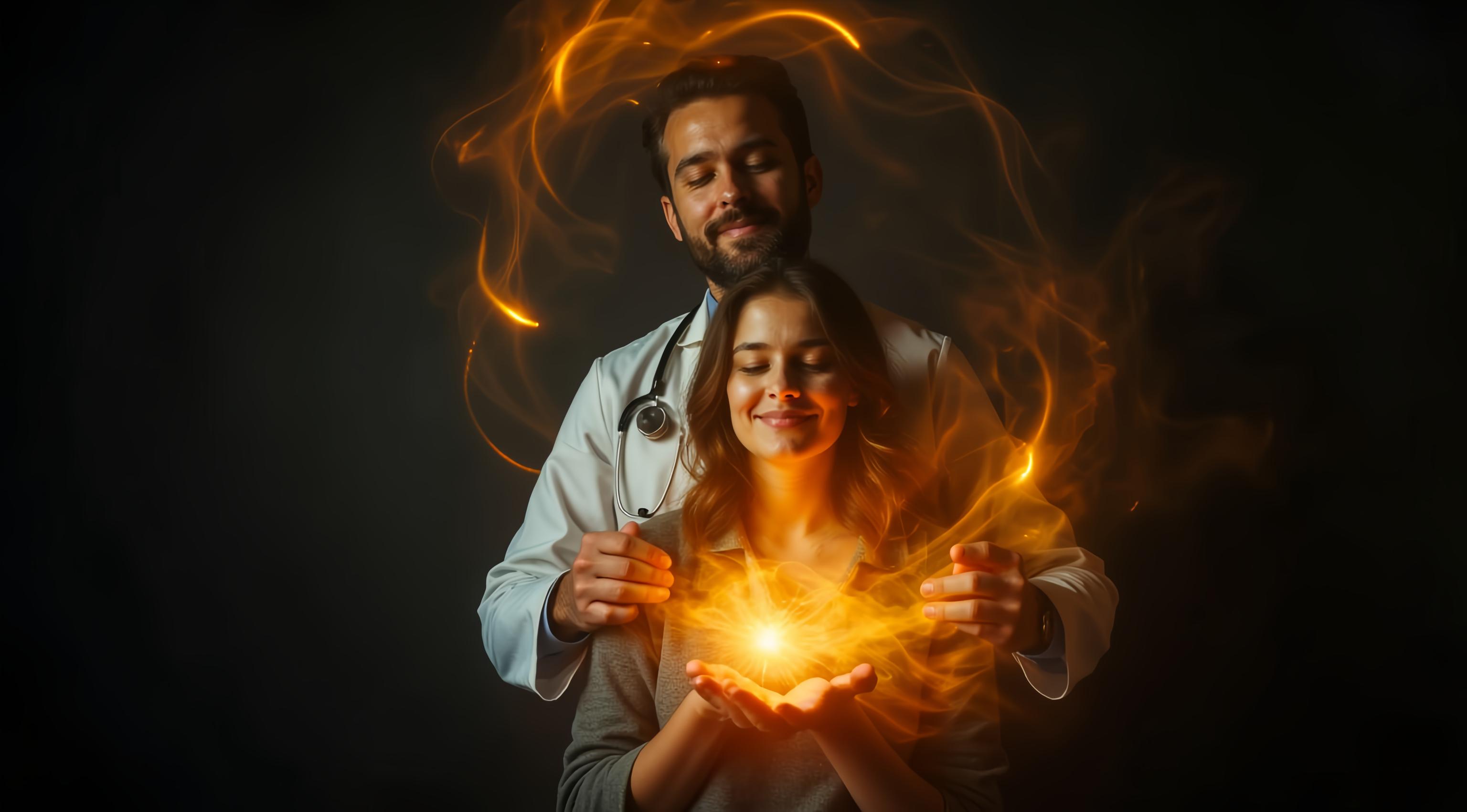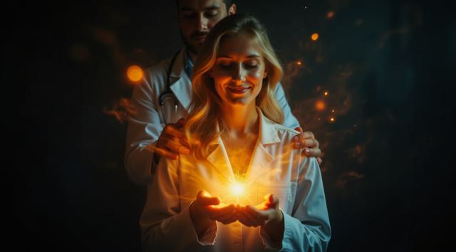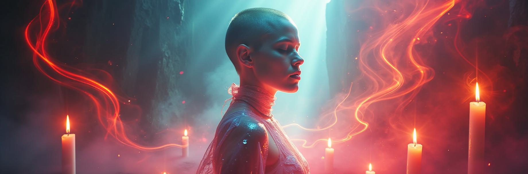 Стиль: цифровая живопись вектор (Курбатов/Маранова). Острая, угловатая композиция., Лысая худощавая девушка-жрица с дерзким взглядом. Перламутровый градиент на её теле: от красного/серого к нежно-розовому, голубому, мятному., Таинственный ритуал с парящими свечами. Ключевой элемент: большое ледяное отражение на стене с прозрачным сиянием и эффектом двойной экспозиции., Магия света: внутреннее свечение, мерцание, глиттер-арт. Атмосфера ледяной мистики и силы.