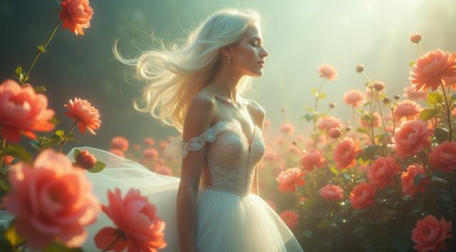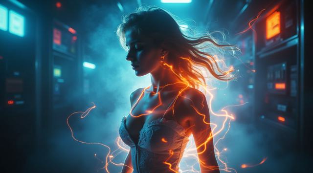 An ethereal digital phantom, a glamorous woman with a plunging neckline, shimmers with electric energy. Epic fantasy realism, an action-packed digital painting, motion blur, lightning sparks, and a vibrant aura. Ultra-detailed, she traverses through glowing electronic devices, embodying spectral grace and raw power.