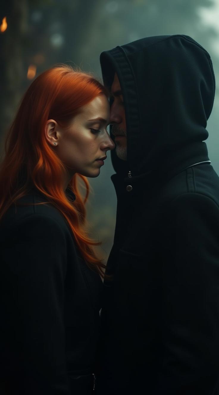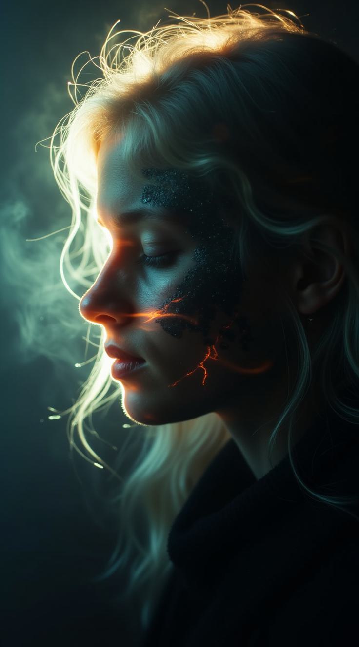 Сгенерируй портрет девушки в профиль, совмещающий образы ангела и демона. Левая половина лица: светлая кожа, длинные белоснежные волосы, мягкий свет, тонкий светящийся нимб над головой. Правая половина лица: тёмная кожа, выраженные демонические рога, текстурированная чёрная кожа с трещинами, мрачный дымчатый эффект. Фон: переплетение серого и красного дыма, создающее атмосферу мистики и дуализма. Реалистичный стиль с элементами фэнтези, высокое разрешение, акцент на контрасте света и тьмы. Выразительные черты лица, детализированные волосы и текстуры кожи. Композиция в портретном формате