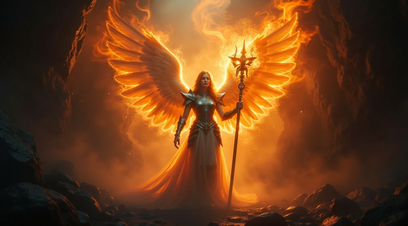 A towering guardian angel emerged from a dark cave, resplendent in silver armour and with magnificent wings. She stood ready to unleash her fury, clutching a blazing staff that crackled with energy. Her eyes burned with determination, and a fireball crackled in her hand. Her presence alone symbolized her resolve to vanquish any who opposed her.