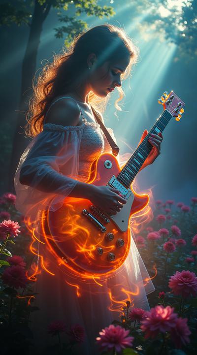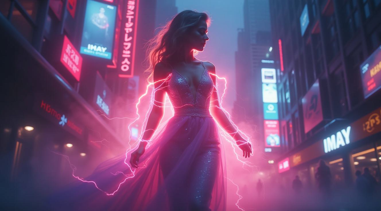 An ethereal digital specter, a glamorous woman in a flowing gown with a deeply cut neckline, electrifies a cyberpunk cityscape. Her form shimmers with dynamic lightning sparks and a vibrant aura, ultra-detailed in epic fantasy realism. She deftly phases through luminous electronic devices, motion blurring as she traverses the intricate network, evoking a sense of powerful, transient grace,