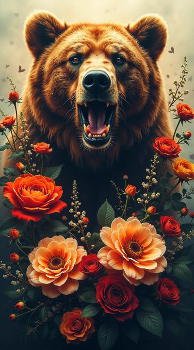В центре композиции — крупный, выразительный медведь с открытой пастью, демонстрирующий зубы;с намёком на агрессию или мощь., Медведь окружён пышным букетом разнообразных цветов — цветы должны органично переплетаться с шерстью медведя, частично «прорастать» сквозь неё., прямо под лапами медведя, размести матрёшку в традиционном русском стиле — с яркими узорами, румяными щёками и платком., Используй насыщенную, контрастную цветовую палитру с акцентом на красные оттенки., Добавь мелкие декоративные детали: листья, ягоды,чтобы усилить ощущение «живой» природы вокруг медведя., Уровень детализации — очень высокий: прорисуй каждую шерстинку, лепесток и узор на матрёшке.