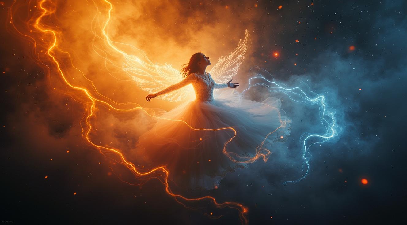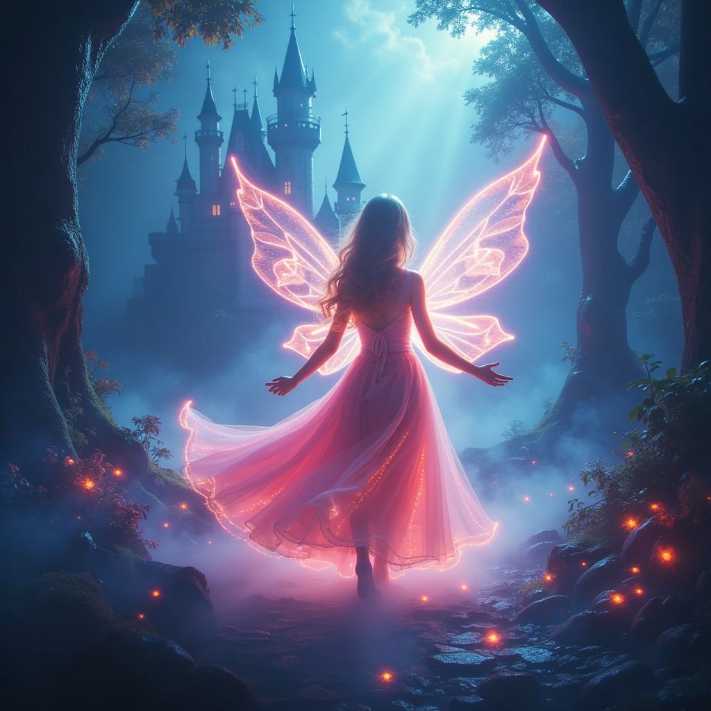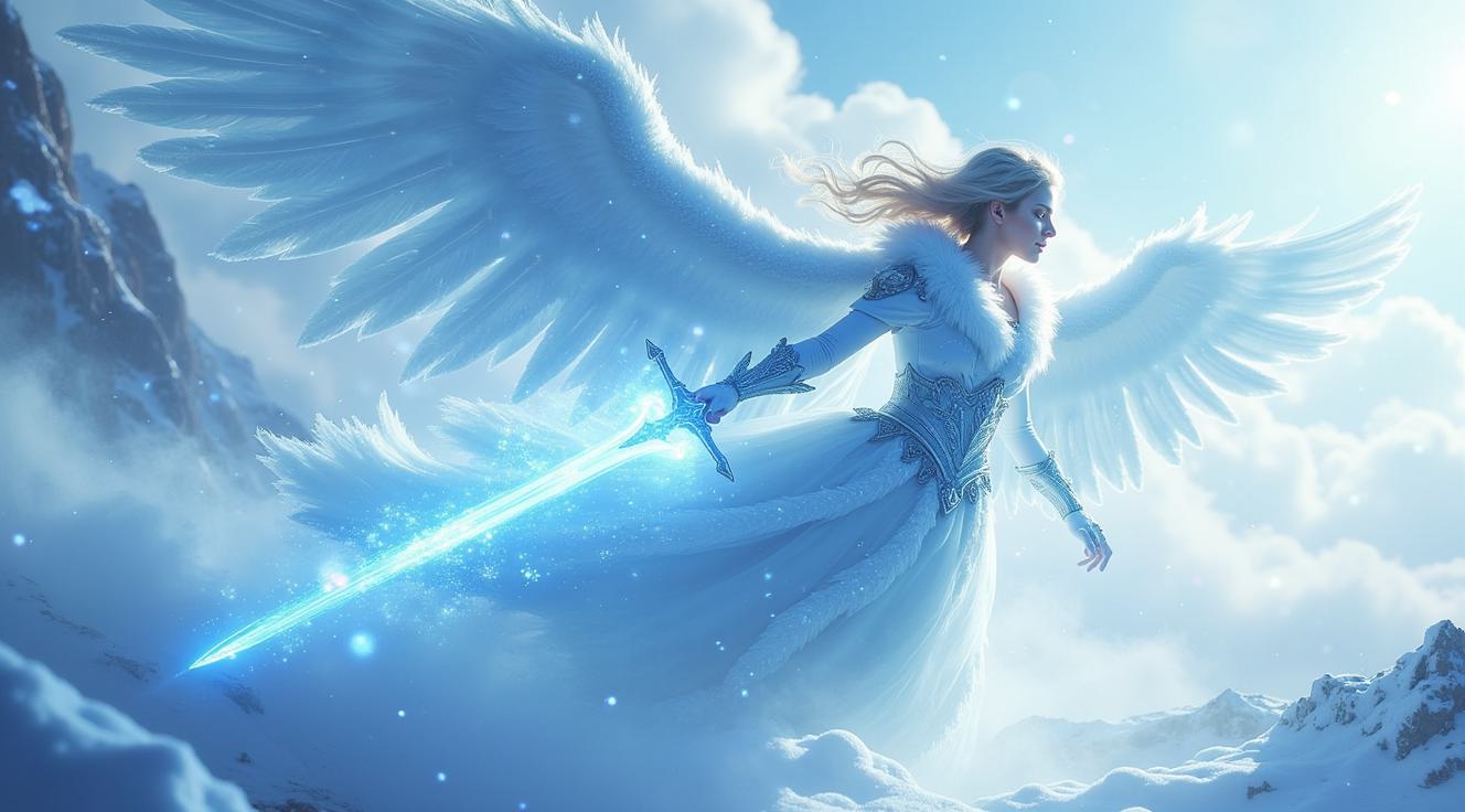 A slender warrior fairy in a sparkling outfit stands amidst snow-covered ruins. Her crystal wings, made from star fragments, shimmer in the fading light. Constellations guide her, and she holds an icy sword with mist rising from its blade. Glowing spheres fill the air with ethereal light. Her intricate feathers seem woven from stars, and frost on her clothing glistens. Her crystal wings refract light, creating a kaleidoscope of colors. She embodies myth and magic.