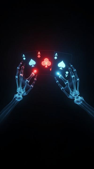 Представь мрачную, мистическую сцену: две призрачные скелетные руки тянутся из тьмы, держа в пальцах светящиеся игральные карты — тузы всех мастей. Карты словно пульсируют неоновым светом на абсолютно чёрном фоне. В центре между руками парят символы мастей, пересечённые в виде мистического знака. Создай ощущение, будто это руки потусторонней силы, контролирующей судьбу через карты. Используй контрастные цвета и эффект свечения для усиления драматизма. Стиль — смесь готики и неонового арт-дизайна