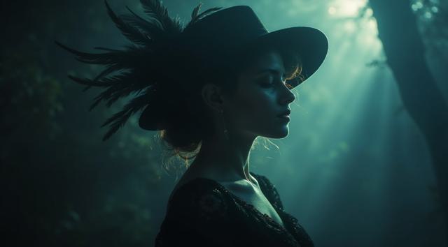 Она парит в сумрачном вихре времени, словно призрак викторианской эпохи. Шляпа с перьями дрожит от магической энергии, будто готова взлететь. Кружевные рукава её платья трепещут, как крылья ночной бабочки, а тёмный бархат одежды мерцает в лунном свете. Взгляд — холодный, пронизывающий, будто клинок, готовый рассечь реальность. Тени вокруг неё оживают, шепчут древние тайны.