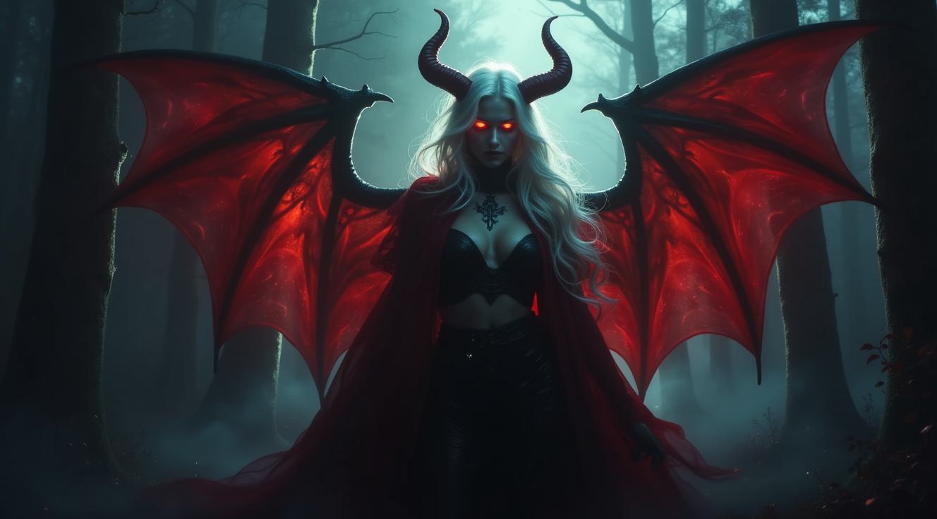 The image is a digital illustration of a female demon with long white hair and horns on her head. She is standing in a dark and eerie forest-like setting with tall trees and pillars in the background. The demon has large red and black wings that spread out behind her, and her body is covered in armor with gold accents. She has a fierce expression on her face and is looking directly at the camera. The overall mood of the image is dark and ominous.