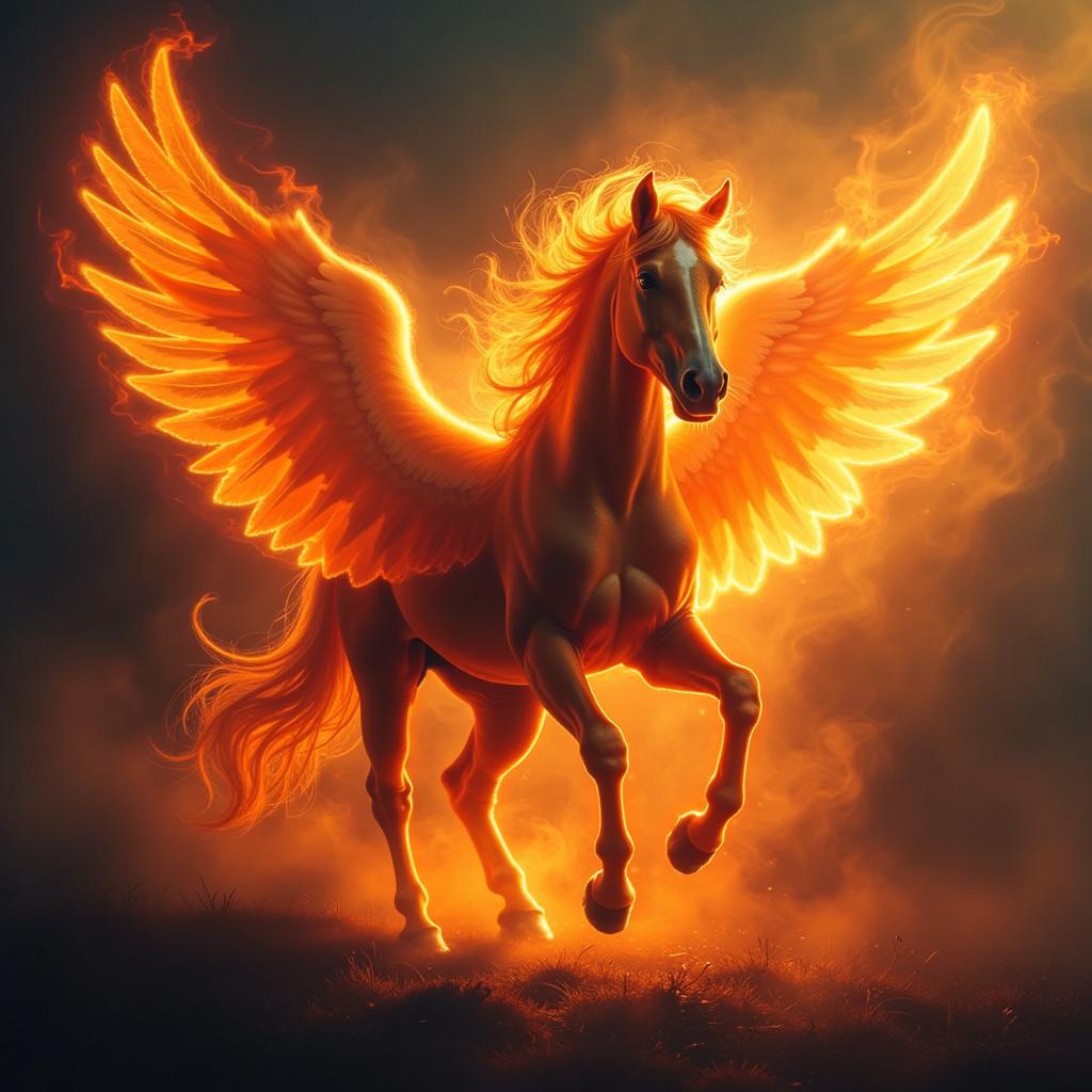 Проект: Принт "Огненная лошадь с крыльями", Описание: Создать принт с изображением огненной лошади с красивой гривой и ангельскими крыльями., , Стиль: Фэнтези, яркие и насыщенные цвета, динамичные формы., Элементы:, - Лошадь с огненными элементами и эффектной гривой, - Ангельские крылья, излучающие свет, - Элементы фона, подчеркивающие магическую атмосферу, Целевая аудитория: Любители фэнтези и оригинальной одежды (возраст 15-35 лет).