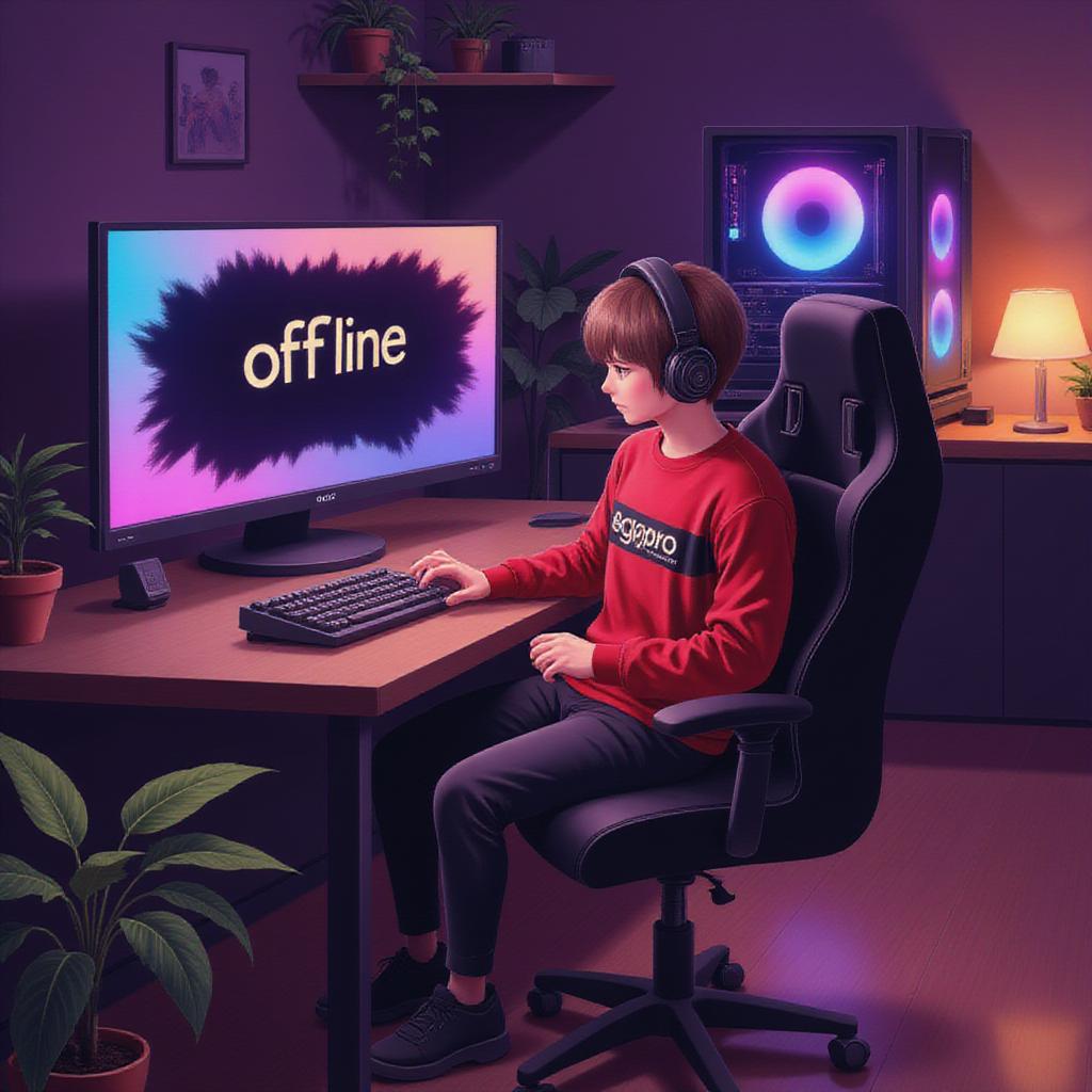Аниме-парень, сидит в игровом кресле перед компьютером, на экране надпись ‘OFFLINE’. На нём наушники, красный чёрный свитшот с надписью egaprobro.Вокруг игровая зона: клавиатура с подсветкой, игровой ПК с RGB-подсветкой, настольная лампа, комнатные растения. Атмосфера уютная, освещение с фиолетовыми и красными оттенками. Стиль — детализированное аниме, мягкие тени, реалистичные текстуры.
