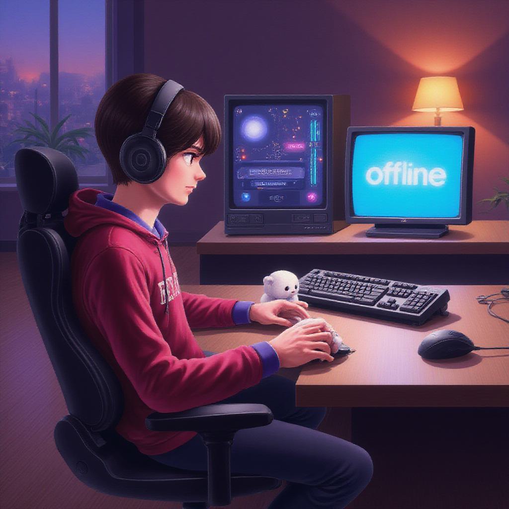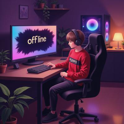 Аниме-парень, сидит в игровом кресле перед компьютером, на экране надпись ‘OFFLINE’. На нём наушники, красный свитшот с надписью, фиолетовые рукава. В руках держит маленькую белую плюшевую игрушку. Вокруг игровая зона: клавиатура с подсветкой, игровой ПК с RGB-подсветкой, настольная лампа, комнатные растения. Атмосфера уютная, освещение с фиолетовыми и красными оттенками. Стиль — детализированное аниме, мягкие тени, реалистичные текстуры.