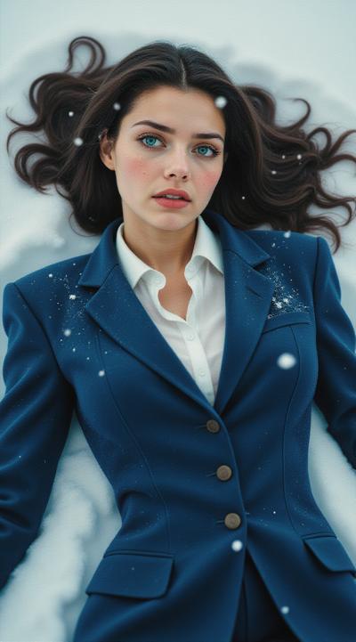 Девушка с голубыми глазами и чёрными волосами, на щёках лёгкие веснушки, глаза как бы стеклянные, в дорогом синем строгом костюме Лежит на снегу, медленно падает снег, печаль, полутени, грустная новогодняя атмосфера, общий план, Реализм, гиперреализм, кинематографичный, эпический масштаб, ультрадетализация, высокое качество, 4К.