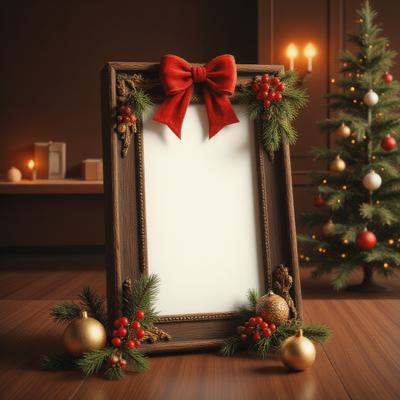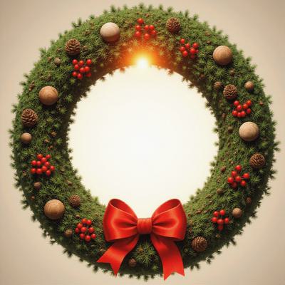 , Фотореалистичный крупный план традиционного рождественского венка, используемого в качестве рамки для фотографий. Круглая рамка сделана из пышных еловых и сосновых веток, украшена красными ягодами, сосновыми шишками и атласным красным бантом. Теплый, сияющий свет исходит из круглого центра, где обычно размещается семейная фотография. Уютная праздничная атмосфера, эффект боке на заднем плане, 8K, детализация.