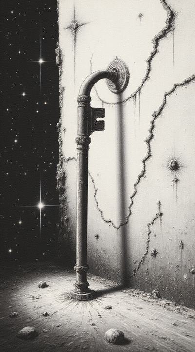книжная иллюстрация, высокая детализация, черно-белая, стиль Альбрехта Дюрера, викторианская готика, высокая контрастность, старая оштукатуренная стена в полумраке, мощный стальной ключ вбит в штукатурку до половины своей длины, от ключа по стене во все стороны расходятся глубокие трещины в штукатурке, словно от сильного удара, некоторые трещины тянутся до края изображения, штукатурка местами осыпалась, обнажив кирпичную кладку под ней, свет падает сверху слева, подчеркивая рельеф трещин и блеск стали ключа, атмосфера необратимости, разрушения и бесповоротного решения, минимализм, символизм