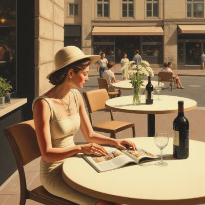 АБСТРАКТНАЯ ЖИВОПИСЬ . АБСТРАКТНАЯ ЖЕНЩИНА АРИСТОКРАТИЧНОЙ ВНЕШНОСТИ НАРИСОВАННАЯ В СТИЛЕ КАРТИН Jack Vettriano, СИДИТ В ПРОФИЛЬ В КАФЕ ЗА СТОЛОМ В КРЕМОВОМ ЛЕТНЕМ ПЛАТЬЕ И В ШЛЯПЕ В ФОРМЕ ВЕДРА МОДЫ 19050 ГОДА И ЧИТАЕТ ЖУРНАЛ, ЛЕЖАЩИЙ НА СТОЛЕ . НА СТОЛЕ БУТЫЛКА ВИНА, БОКАЛ И ВАЗА С БЕЛЫМИ ЦВЕТАМИ . ФОН КАРТИНЫ ОКНО ИЗ КАФЕ С СОВРЕМЕННЫМИ ДЕКОРАТИВНЫМИ ЖАЛЮЗЯМИ