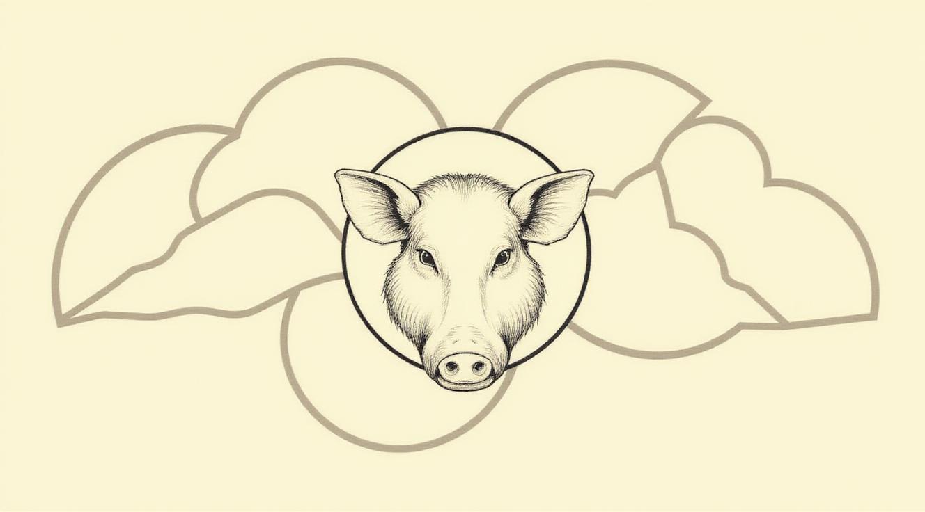 Сгенерируй линейный рисунок, в котором по центру расположена голова кабана, нарисованная контурно, как логотип, а вокруг головы изображены абстрактные крупные изогнутые формы, 4-5 штук, как будто всю картинку нужно будет вырезать по кусочкам на дереве, Формы расположены так, что все это складывается мозаикой вокруг головы кабана