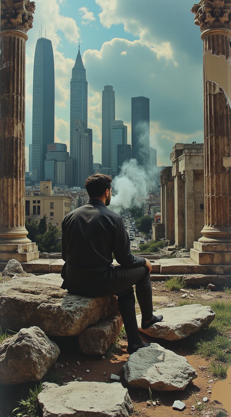 "A cinematic shot of a god-like figure sitting on a throne of obsidian ruins overlooking a futuristic dark Rome. He has a calm, stoic face, eyes glowing with dim white light. He is exhaling thick grey smoke (sulfur). In the background, modern skyscrapers clash with ancient Roman columns. Dark noir atmosphere, ethereal shadows, embers falling like snow. Style: Dark Fantasy, hyper-realistic, 8k, dramatic lighting, 'Eminence in Shadow' aesthetic."