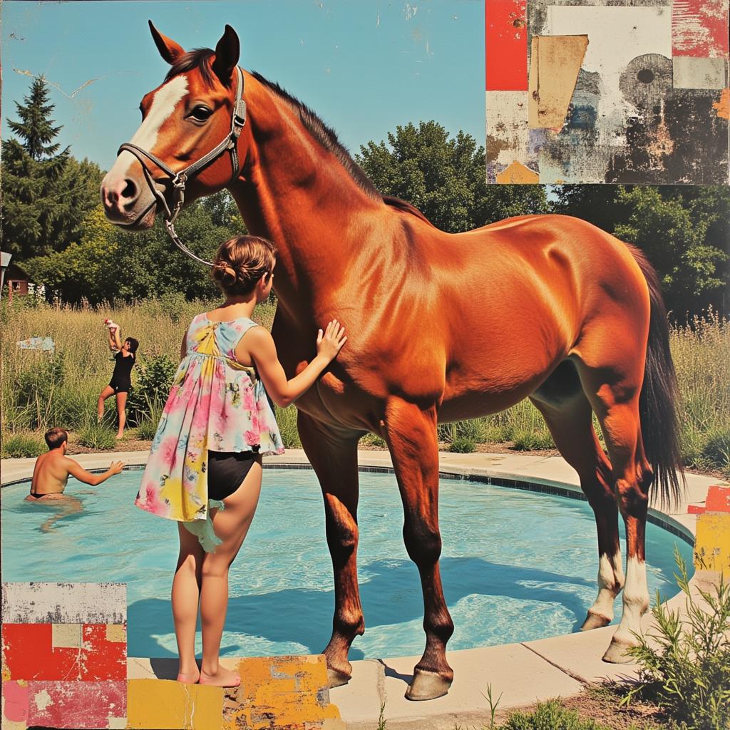 A symbolic painting in the spirit of Kuzma Petrov‑Vodkina: a majestic red horse in a lake, on which sits a rider in shorts. The horse reared. The color of the horse is bright scarlet, with blue-green shades of water, sky with clouds. Spherical perspective, flat image, clear silhouettes. Two more horses (white and reddish) are visible in the distance. heat. Style: modernism with elements of icon painting. Rich, pure colors, a minimum of semitones and high-quality graphics.