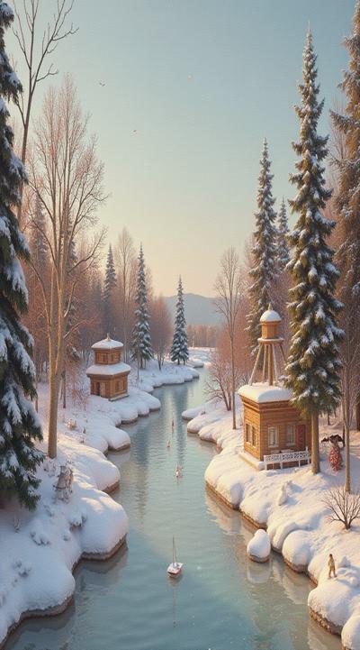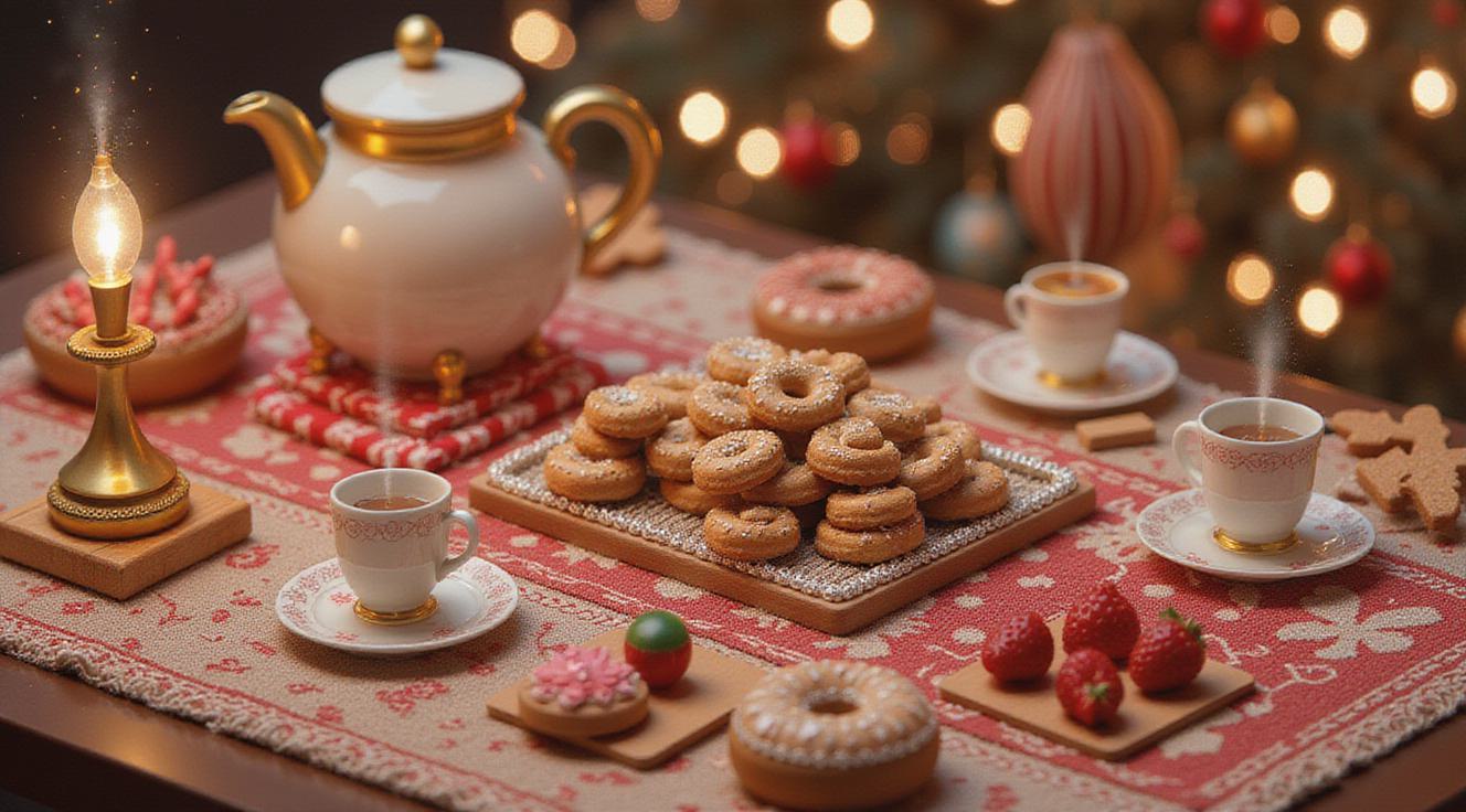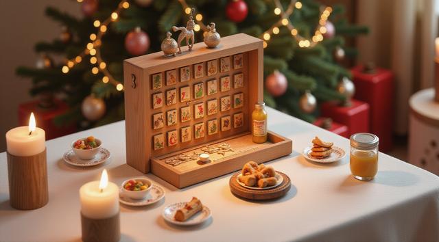 нарисуй Фотореализм 16:9, несколько вариантов. Уютный праздничный стол с белой льняной скатертью, на заднем плане — ёлка с гирляндами. В центре крупным планом в фас — открытый деревянный ящик календарь Адвента с 31 окошком, в окошках миниатюрные символы 3d мини версии продуктов и новогодних блюд: банка салата, бутылка морса, сыр, звезда (сюрприз), баночка приправы, маленькая запечённая курочка, стаканчик с глинтвейном и другие новогодние блюда. Свет — тёплый вечерний, с мягкими тенями. Без людей, без текста, без логотипов.