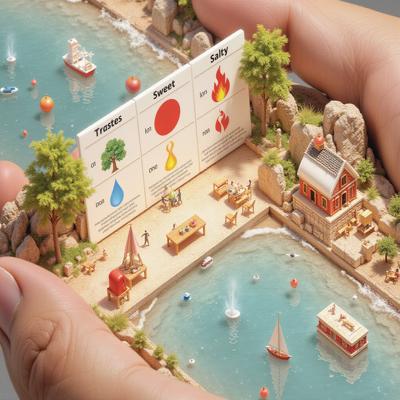 Высокодетализированная инфографика, учебный плакат. Таблица из двух колонок. Заголовки таблицы: Левая колонка: "Вкусы". Правая колонка: "Стихии". Содержание таблицы: 1. Сладкий - [Иконка Земли] [Иконка Воды] 2. Кислый - [Иконка Земли] [Иконка Огня] 3. Соленый - [Иконка Воды] [Иконка Огня] 4. Острый - [Иконка Огня] [Иконка Воздуха] 5. Горький [Иконка Воздуха] [Иконка Эфира] 6. Вяжущий - [Иконка Воздуха] [Иконка Земли]. Стихии должны быть изображены одинаковыми иконками-символами. Каждый тип стихии имеет уникальную и стилистически единую иконку: Земля - Камень. Вода - Волна, капля. Огонь - Пламя, искра. Воздух - Перо, завихрение ветра. Эфир - сфера.
