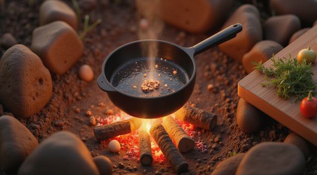 Cinematic food photography, campfire cooking scene: cast-iron skillet sizzling over glowing embers, wooden cutting board with fresh herbs and vegetables nearby, soft golden hour light, warm earthy tones (ochre, olive, charcoal), shallow depth of field. Left side detailed, right side clean and minimal for text overlay. No people, no logos, realistic style, 1920x768 aspect ratio.