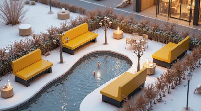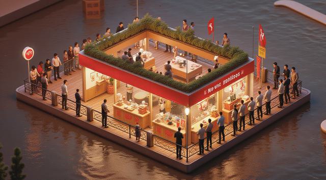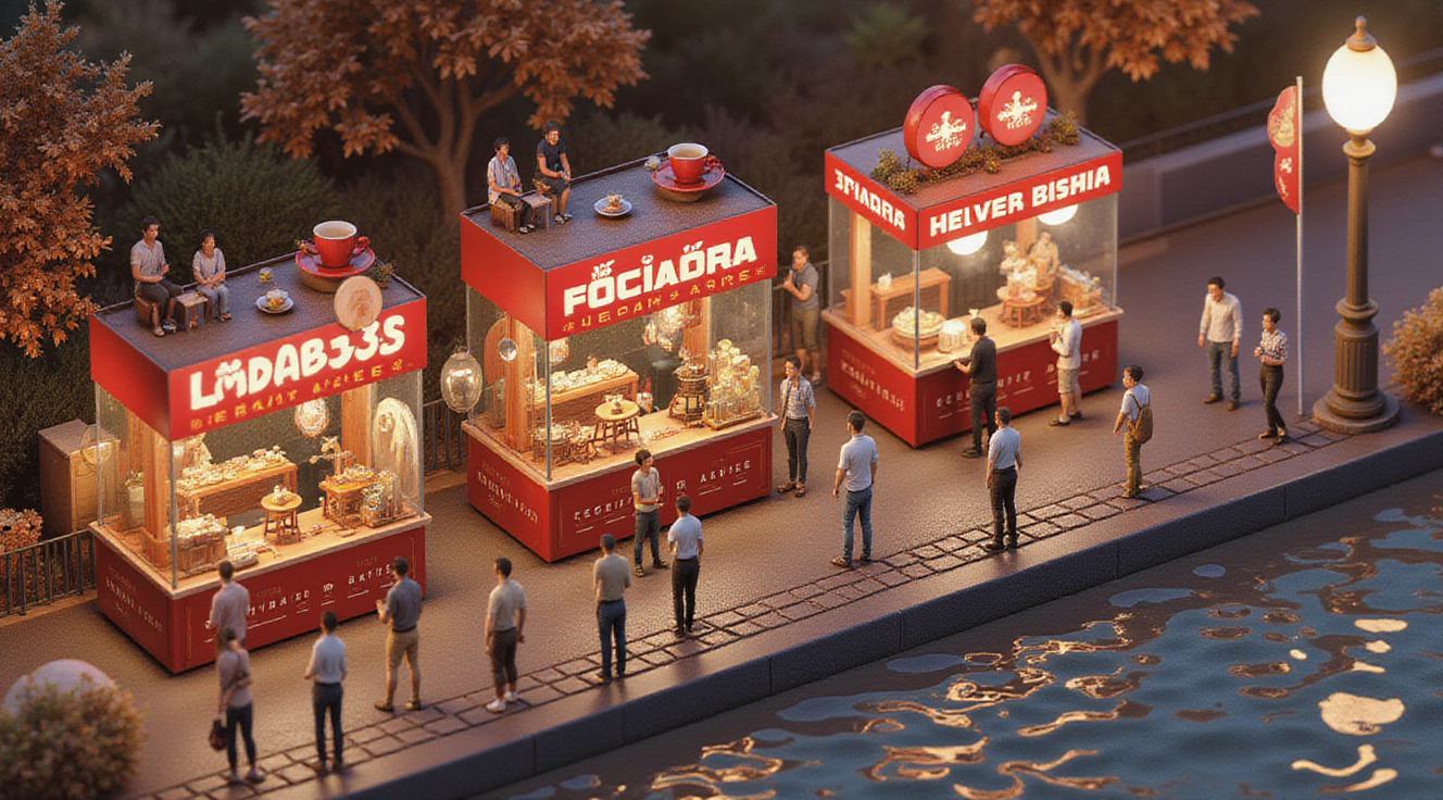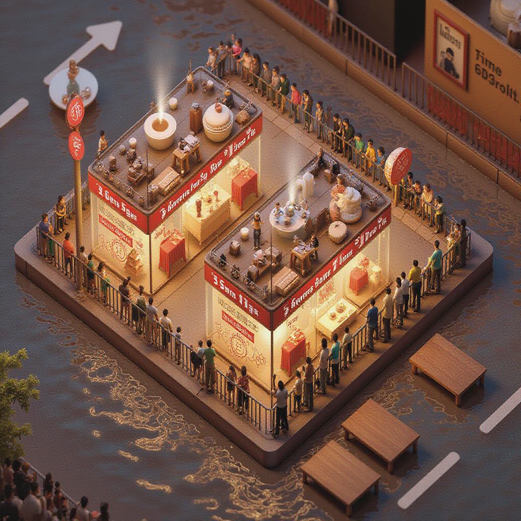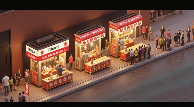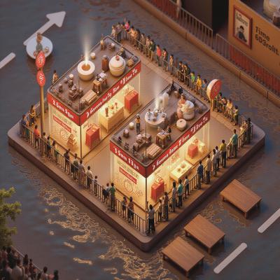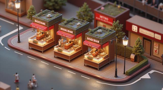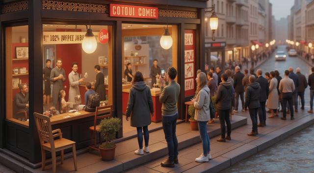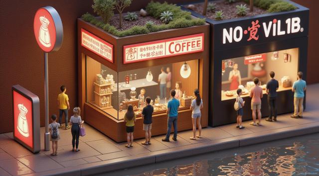 Улица возле метро и на ней три кофе точки для продажи готового кофе, у первых двух очень похож дизайн. У третьей точки дизайн ярче и выделяется среди конкурентов и большая длинная очередь, а также люди фотографируются на телефон у этой точки, а у первых двух точек стоит по парочке человек или вообще никого нет.