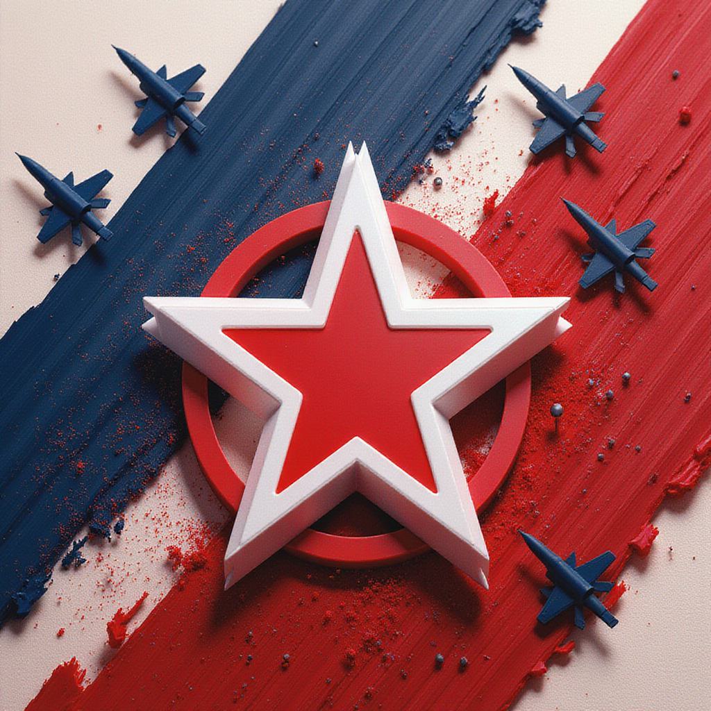 Modern patriotic Russian design with a large multi-layered red star in the center with a white outline and soft shadow; dynamic diagonal brush strokes in dark blue and bright red on the front, a half-tone circular texture in the blue area, dark blue fighter jet silhouettes at the top, and a white tank silhouette on a red background; three small red stars aligned at the bottom corners; clean white edges of the card, light paper texture, and high-contrast flat vector shapes combined with precise brush strokes create a military-style celebration atmosphere with clear lighting and realistic material sheen.