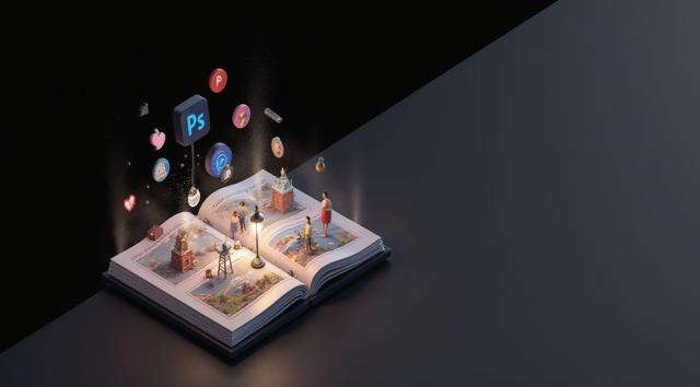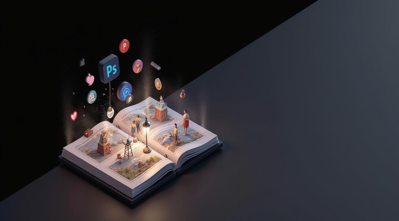 Минималистичная обложка сайта. СЛЕВА — ассоциации с ПОРТФОЛИО ТВОРЧЕСКОГО СПЕЦИАЛИСТА, изобразить РАСКРЫТЫЙ АЛЬБОМ, А ИЗ НЕГО ВЫЛЕТАЮТ ЛОГОТИПЫ, ЛАЙКИ, ЗНАЧКИ: PHOTOSHOP, FIGMA, TILDA И ДРУГИЕ И ВОЗМОЖНЫЕ АССОЦИАЛИЧНЫЕ ОБЪЕКТЫ. СПРАВА — большое пустое пространство с полупрозрачным градиентом от чёрного к тёмно-фиолетовому, К НИЗУ ИЗОБРАЖЕНИЯ ИДЕТ ОДИН РОВНЫЙ ТОН. Стиль: цифровой минимализм, киберпанк. Цвета: фиолетовый, электрик, тёмно-серый, желтый. Вся композиция на тёмном фоне. Цифровой минимализм, неоновые акценты. Ассоциации: рост, автоматизация, стратегия, результат.
